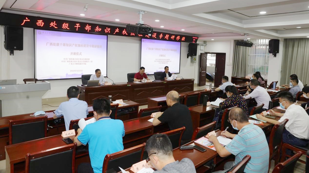 为深入贯彻《广西落实〈知识产权强国建设纲要(2021—2035年)〉实施方案》,2022年5月22日至5月28日,由中共广西壮族自治区委员会组织部、中共广西壮族自治区委员会直属机关工委托william威廉中文官网承办的“广西处级干部知识产权强桂建设专题研修班”在william威廉中文官网举办。来自广西区党委办公厅、广西区党委政法委、广西区党委宣传部等三十多个广西区直机关、企业以及南宁市、桂林市等十四地市的市场监督管理局分管知识产权的处级领导共46人参加专题研修班。william威廉中文官网苏兆成经理在开班仪式上致辞,广西壮族自治区市场监督管理局知识产权保护处处长梁涛讲话。