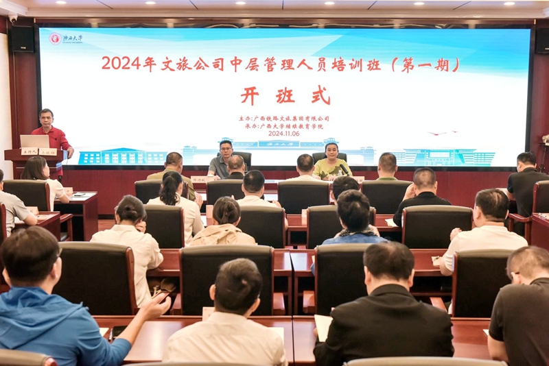 11月6日,2024年文旅公司中层管理人员培训班(第一期)在公司开班。广西铁路文旅集团有限公司总经理邓顺秋、公司副经理曾海艳出席开班式。